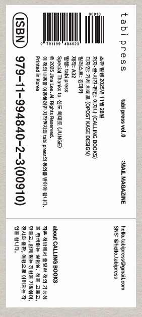 지난 11월 서울 언리미티드 에디션을 마감으로〈tabi press vol.0 MAIL MAGAZINE〉라는 이름으로 제작해 12월 도쿄 아트 북 페어에서도 인기였습니다.:)